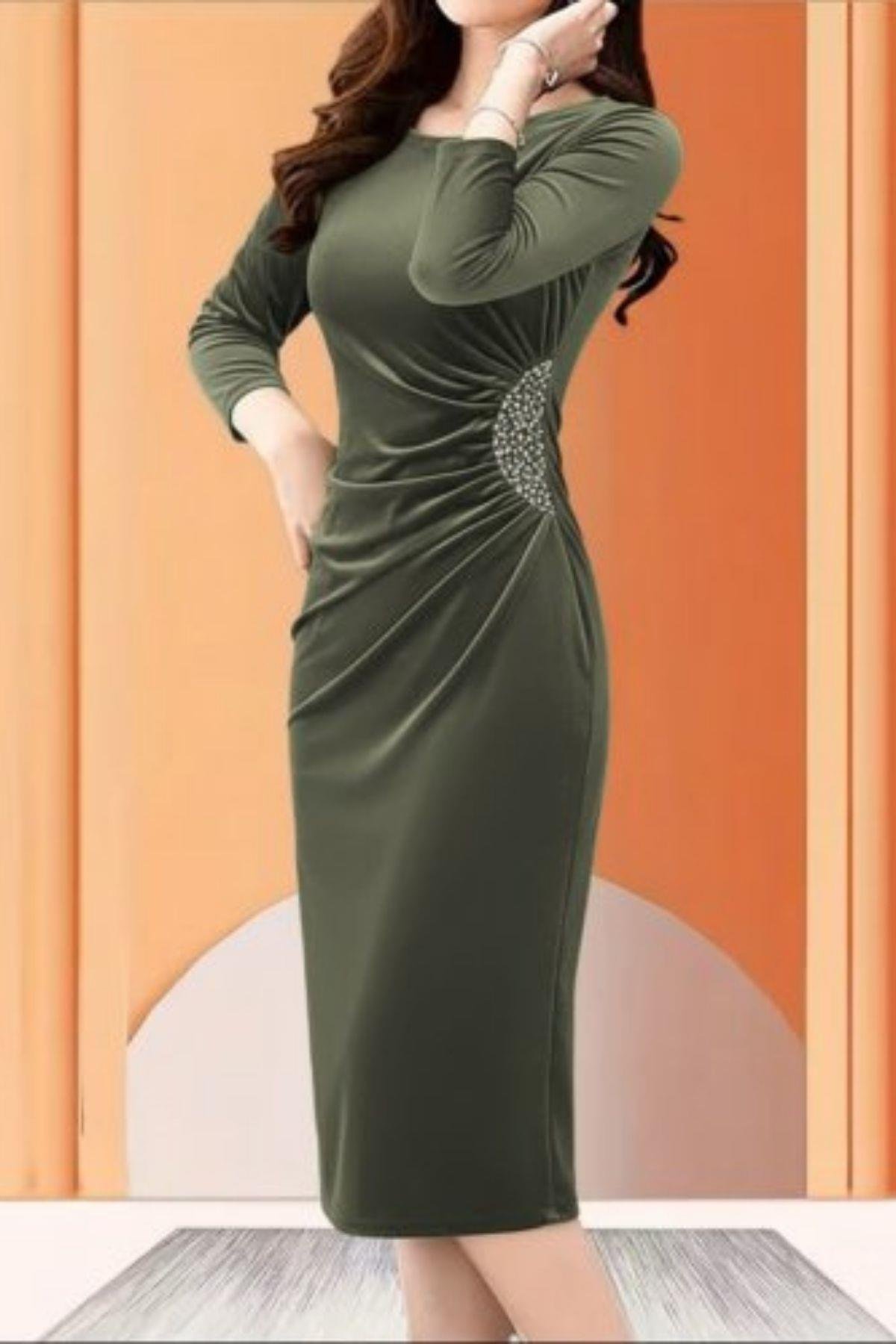 Uzun Kollu Taş Detaylı Midi Kadife Elbise - Haki (JS46115-HAKİ)