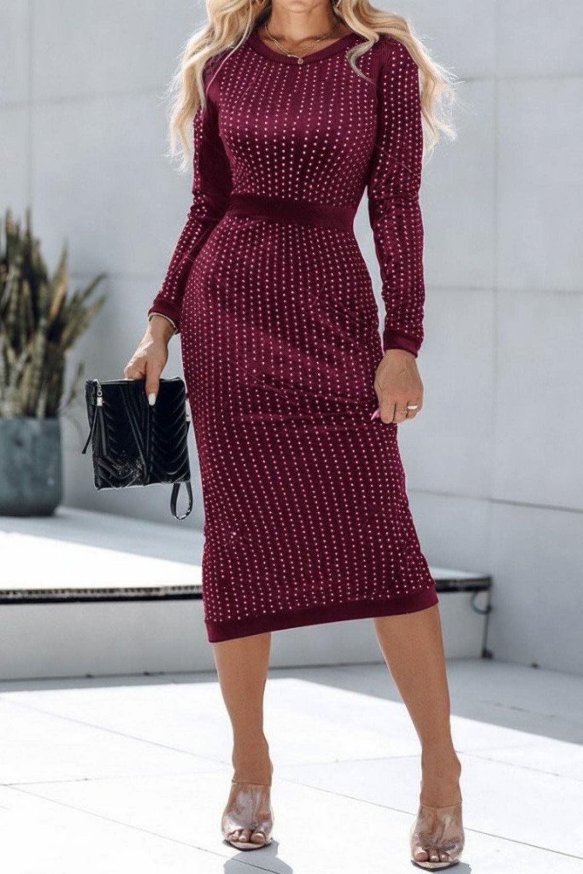 • Göz Kamaştırıcı Şıklık: Işıltılı nokta taş işlemeleriyle bezeli bu uzun kollu midi elbise, katıldığınız davetlerde tüm bakışları üzerinize çekecek. Vücudu nazikçe saran dar kesimi, zarif ve sofistike bir siluet yaratır.