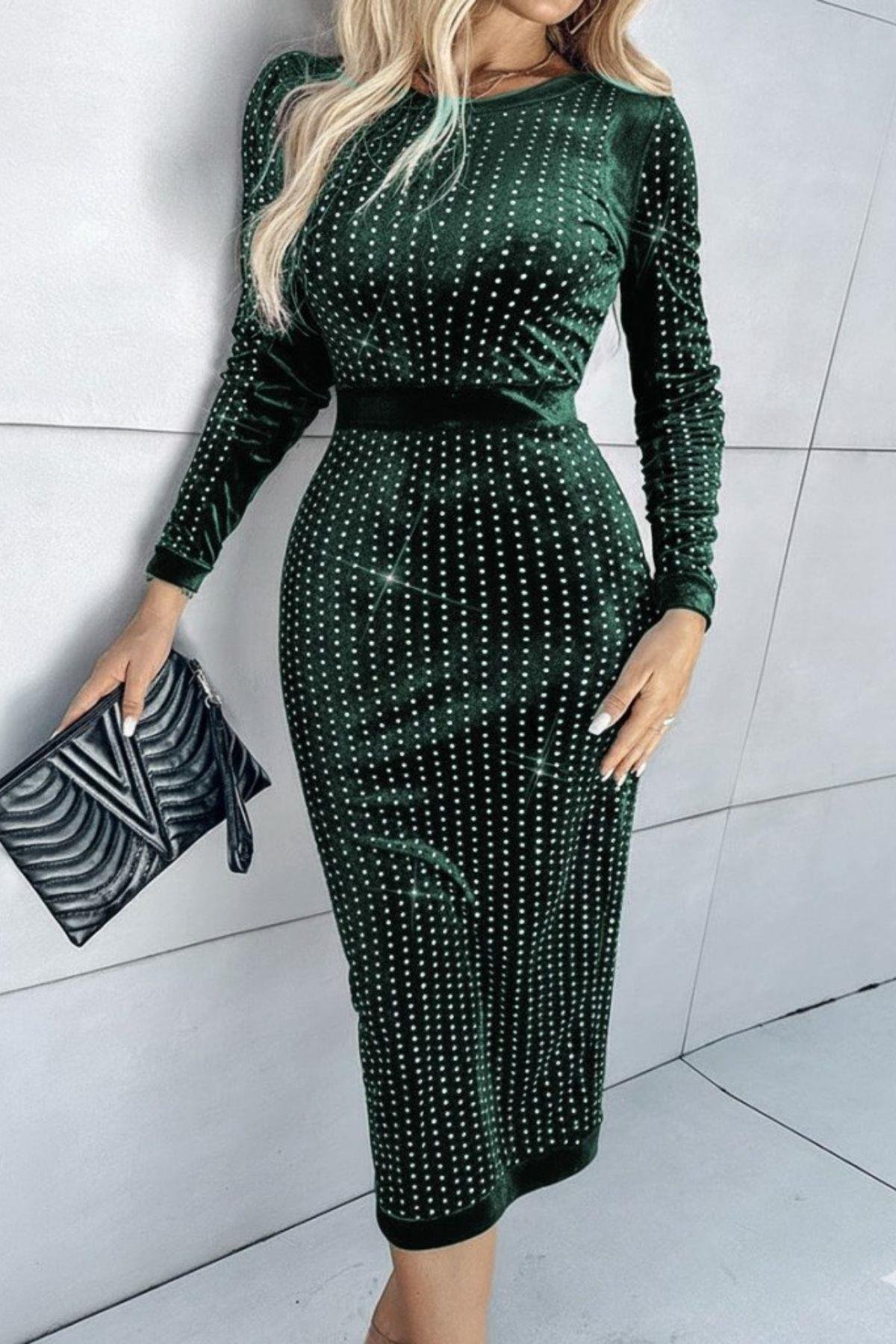 Uzun Kollu Taşlı Midi Kadife Elbise - Yeşil