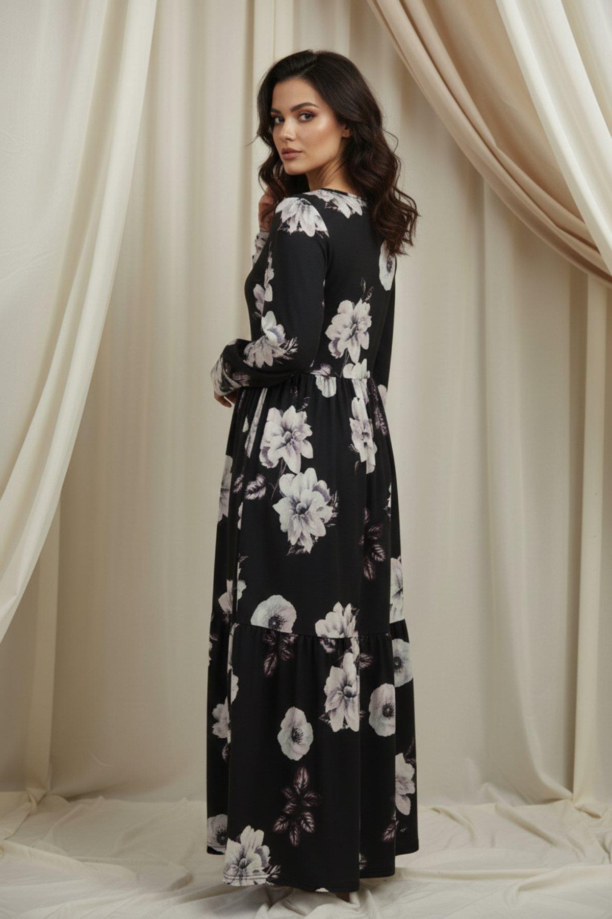 Uzun Kollu V Yaka Süprem Çiçek Desenli Elbise - Siyah (JS76199-SİYAH)