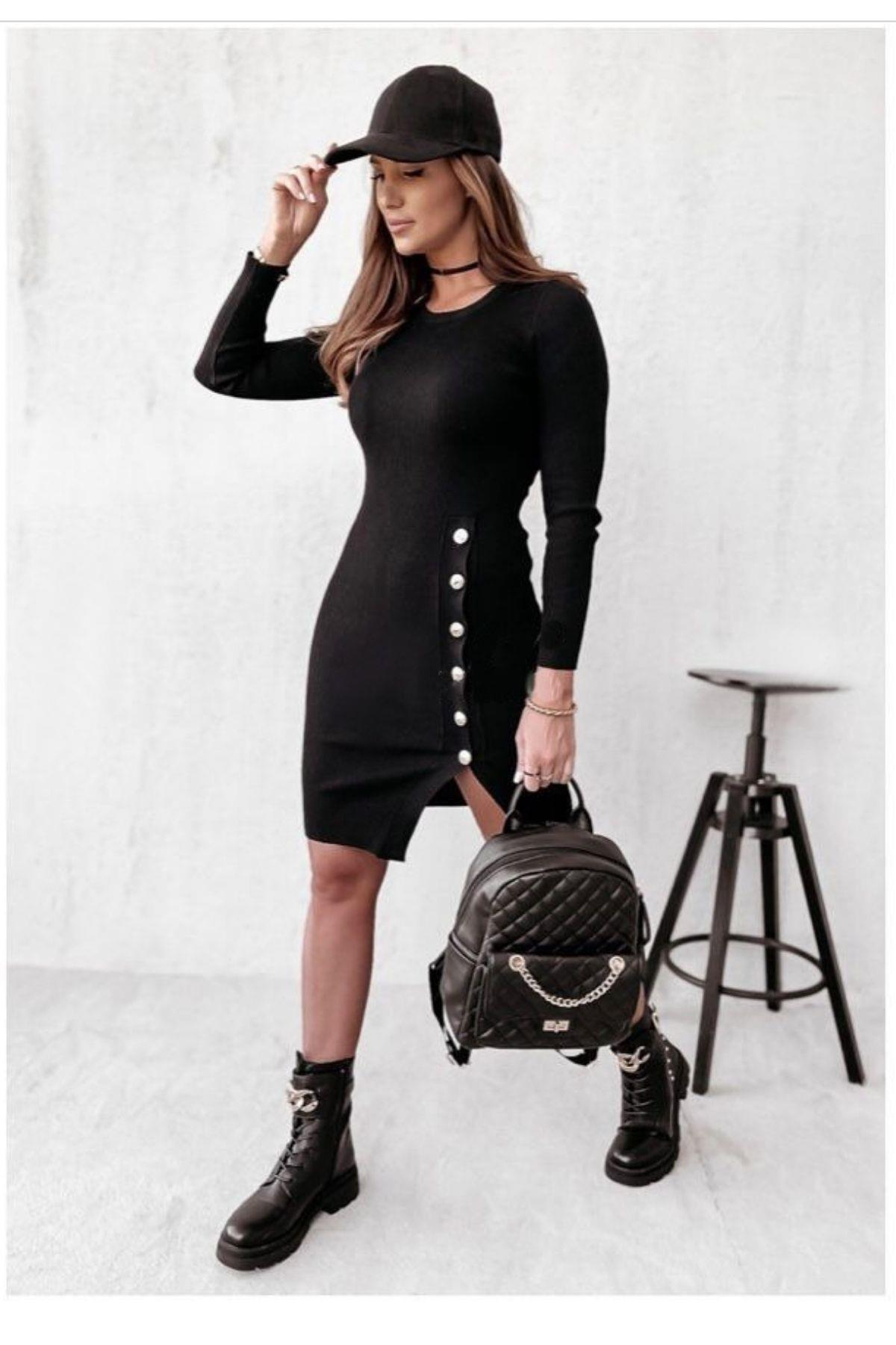 Uzun Kollu Yırtmaçlı Düğmeli Kaşkorse Elbise - Siyah