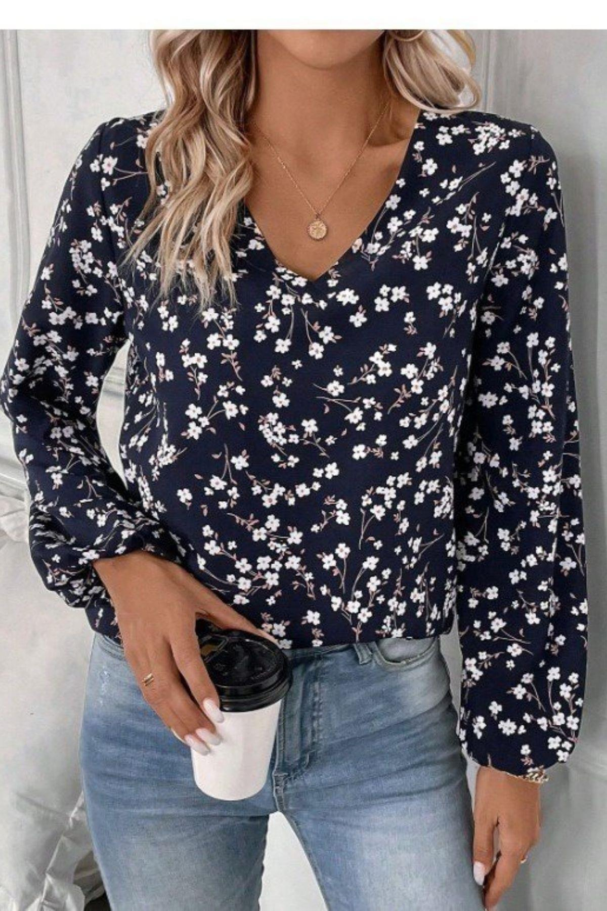 V Yaka Çiçek Desenli Modal Bluz - Lacivert