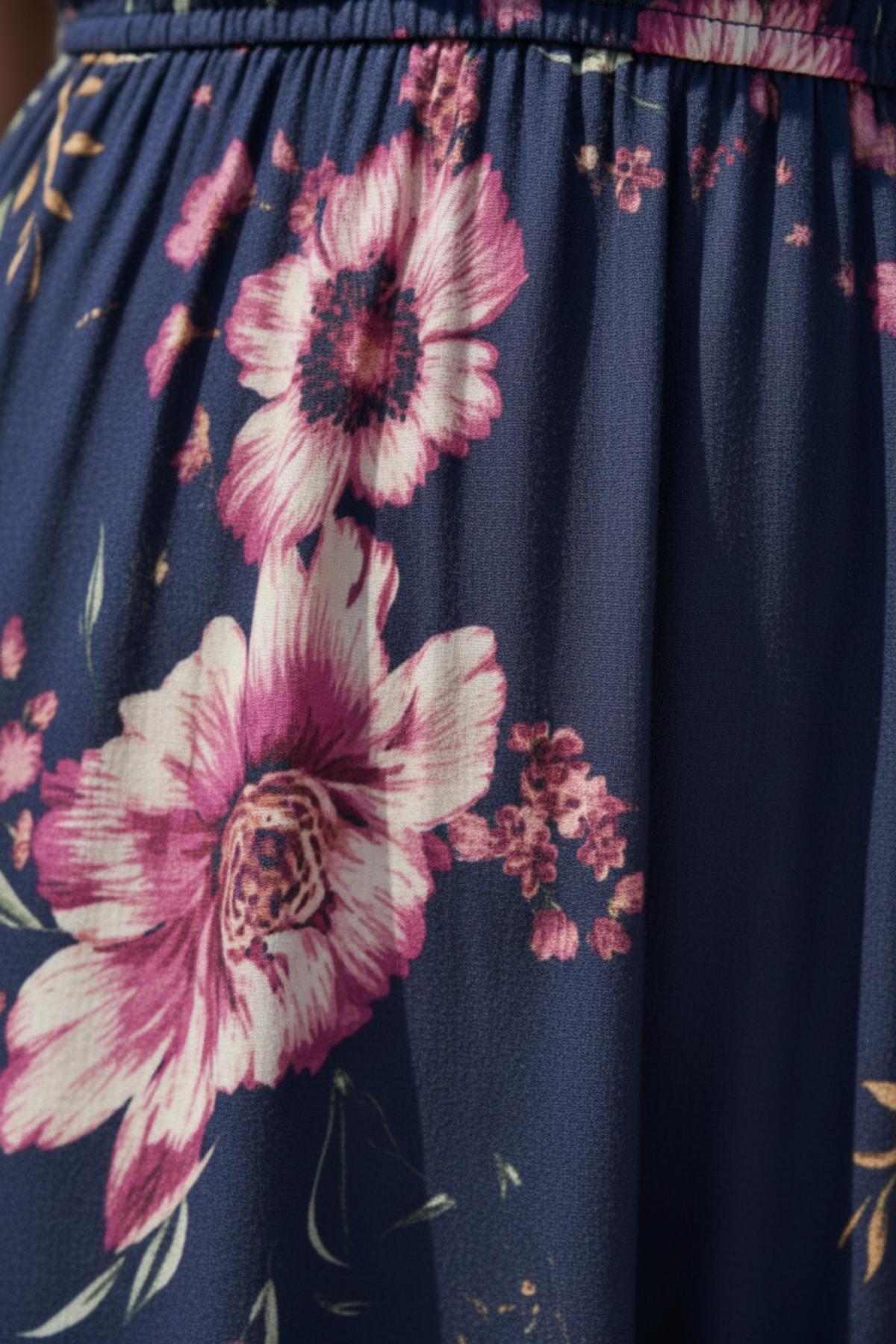 V Yaka Fırfır Kollu Çiçek Desenli Yırtmaçlı Uzun Süprem  Elbise - Lacivert