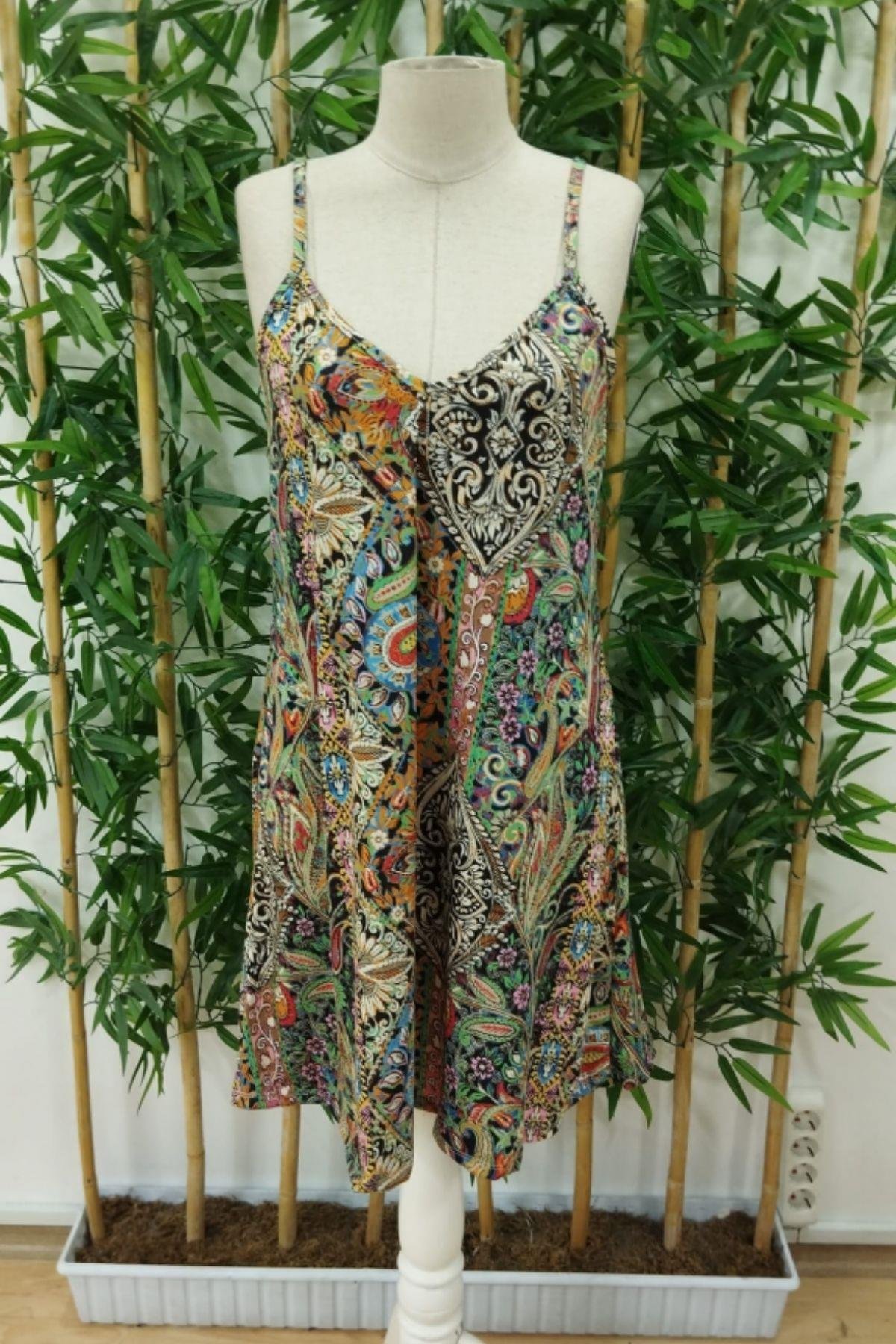 Sıcak yaz günlerinin vazgeçilmezi olacak bu askılı mini elbise, etnik esintili desenleriyle stilinize hareket katacak. V yaka kesimi ve ince askılı tasarımıyla hem rahat hem de feminen bir duruş sunarken, dökümlü A kesimiyle gün boyu konfor sağlar. Sahil kenarından şehir gezilerine kadar her ortamda rahatlıkla kullanabileceğiniz bu elbiseyi, sandaletler ve hasır şapkalarla tamamlayarak bohem bir stil yaratabilirsiniz.