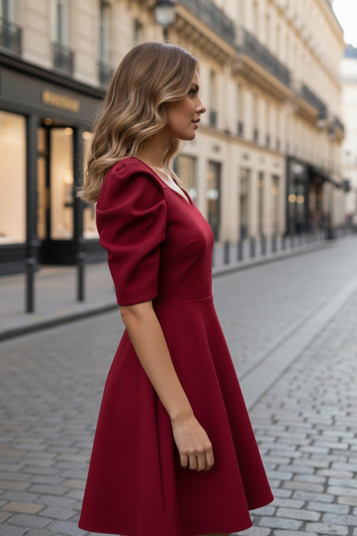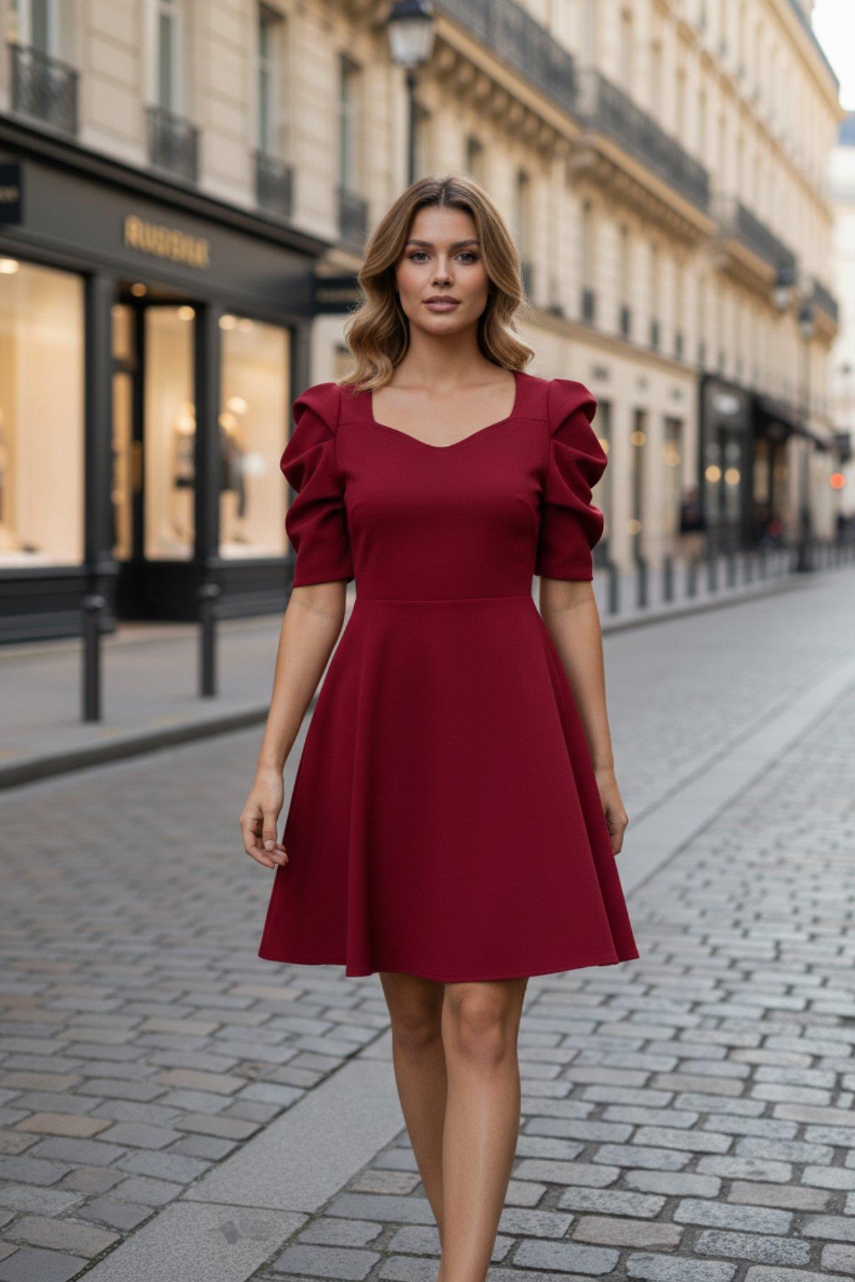 • Özgün Tasarım: Kalp yaka dekoltesi, boyun ve omuz çizgisini zarifçe ortaya çıkarırken, kabarık (puff) kısa kolları ile romantik ve modern bir dokunuş katıyor.