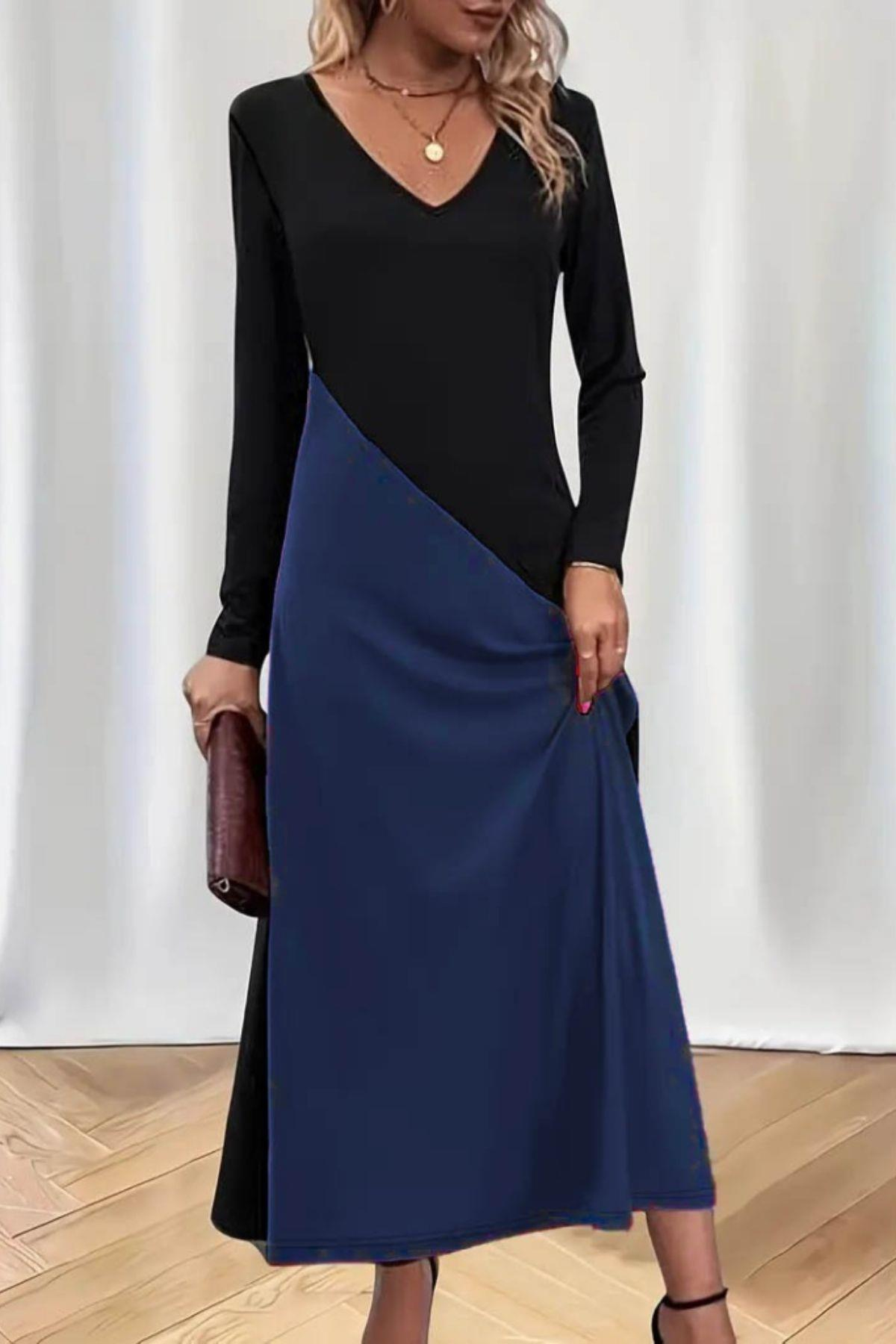 V Yaka Renk Bloklu Viskon Elbise - Lacivert