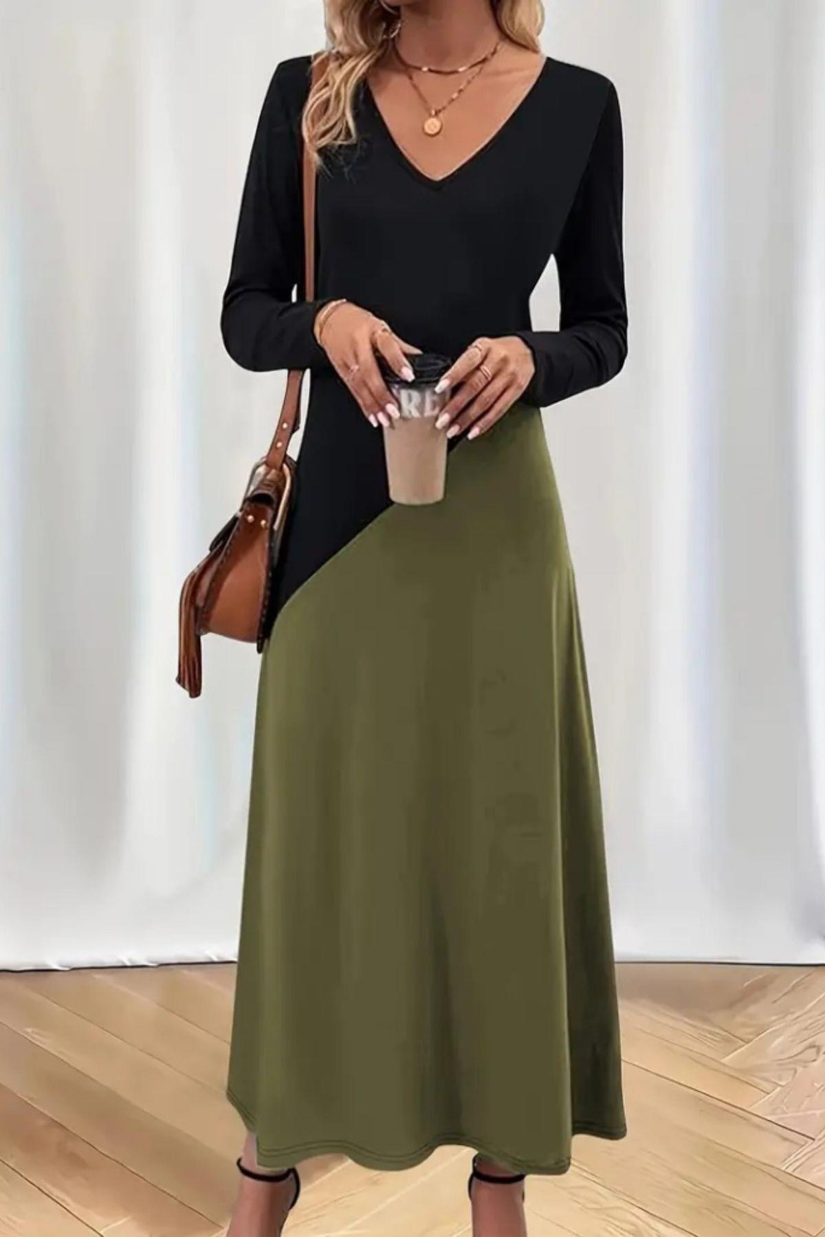 V Yaka Renk Bloklu Viskon Elbise - Yeşil