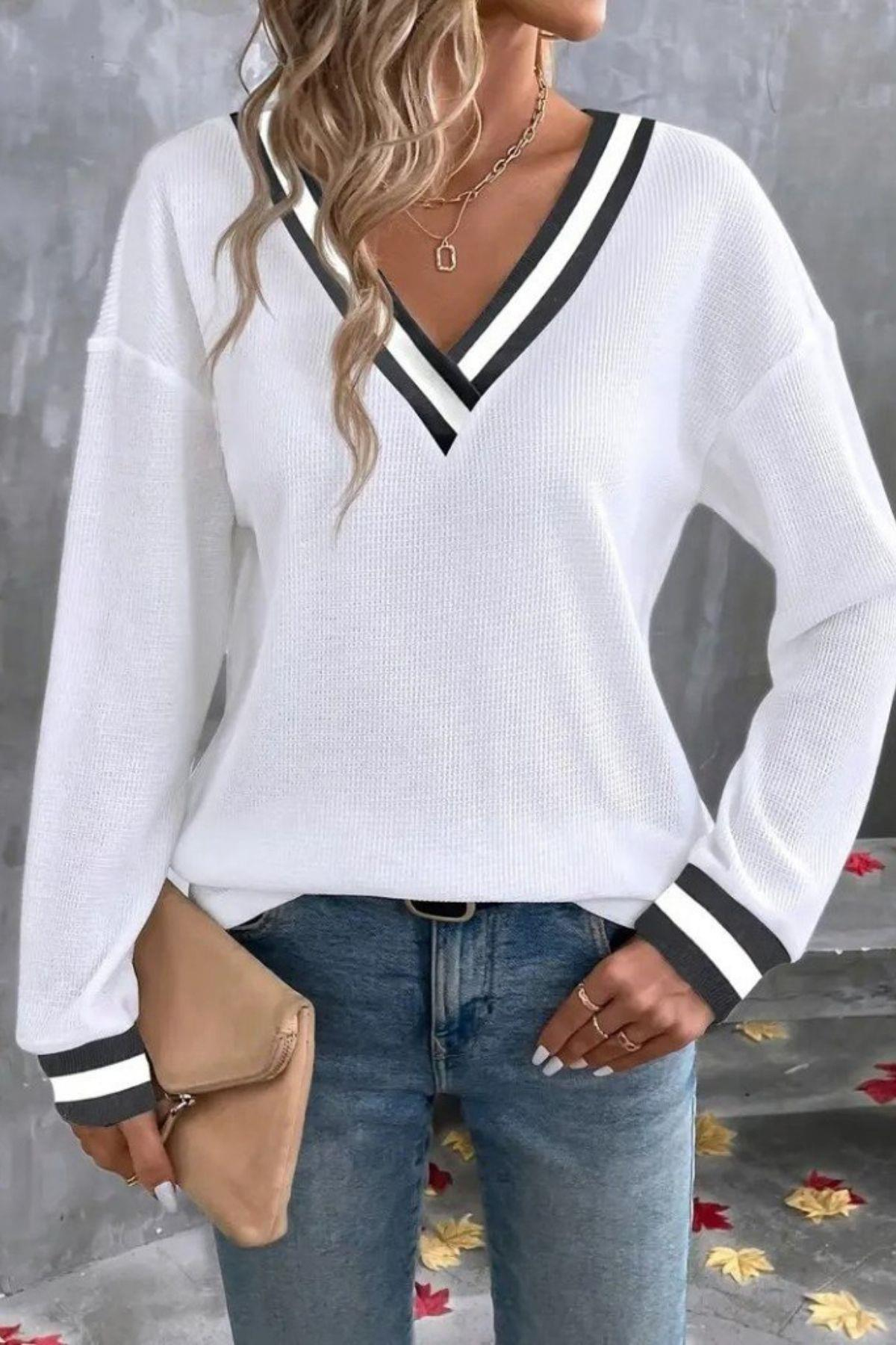V Yaka Şerit Detaylı Waffle Bluz - Beyaz