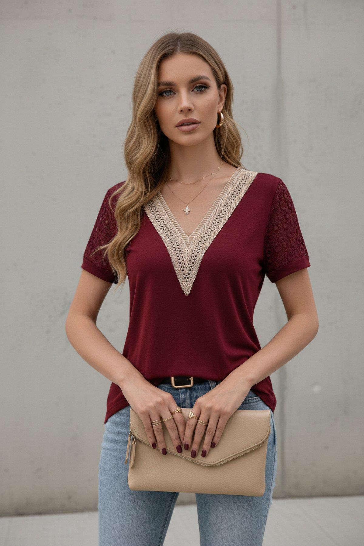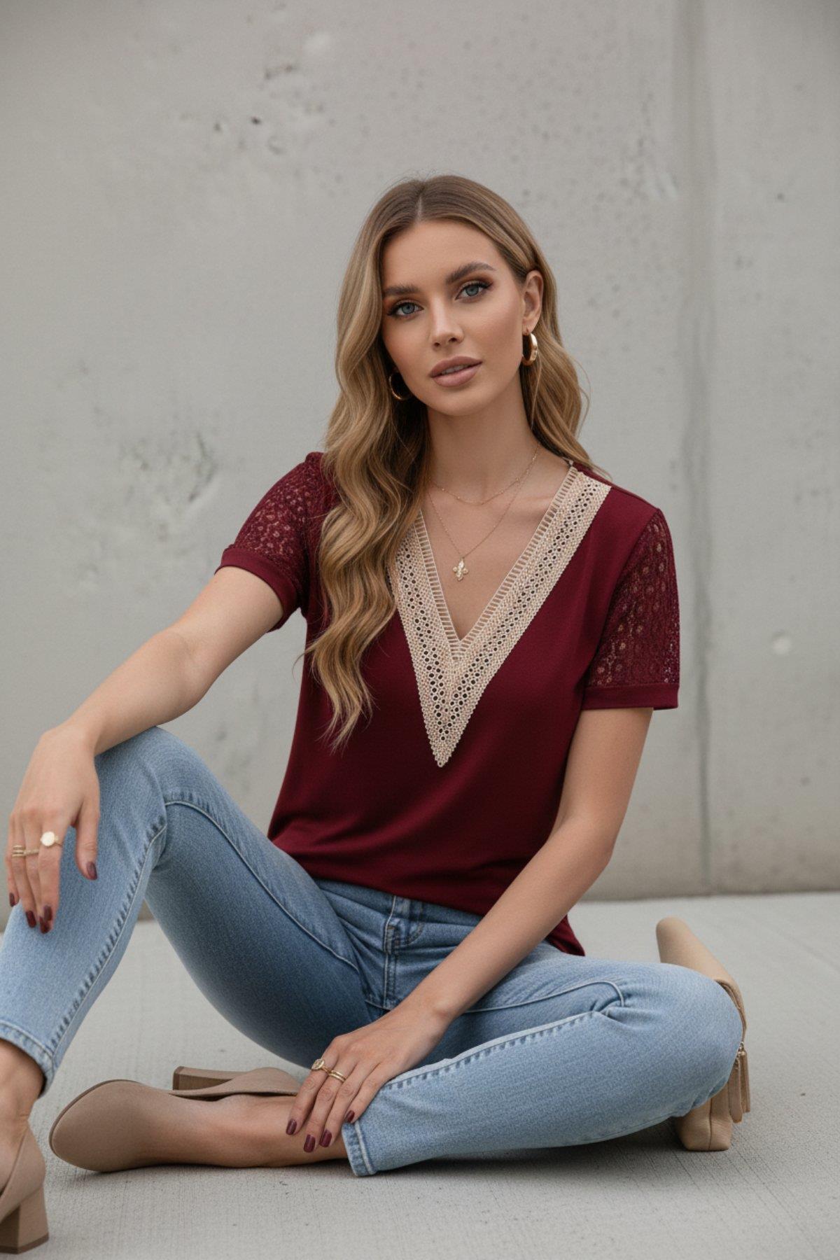 Yaka Ve Kol Dantel Detaylı Basic Viskon Bluz - Bordo