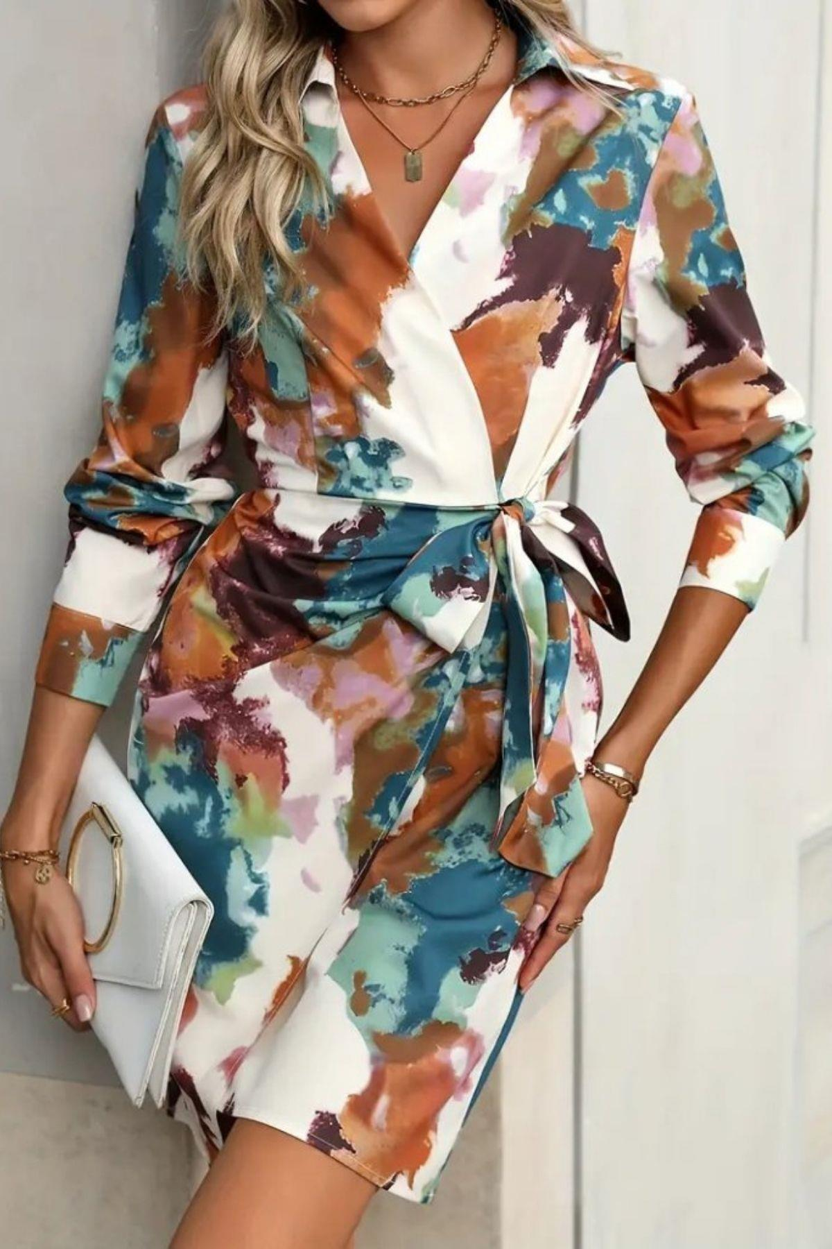 Canlı deseni ve zarif kesimiyle dikkat çeken bu anvelop (kruvaze) mini elbise, hem ofis şıklığı hem de özel günler için ideal. Kendinden kuşak detayı ile belinizi vurgulayarak zarif bir silüet oluşturur.