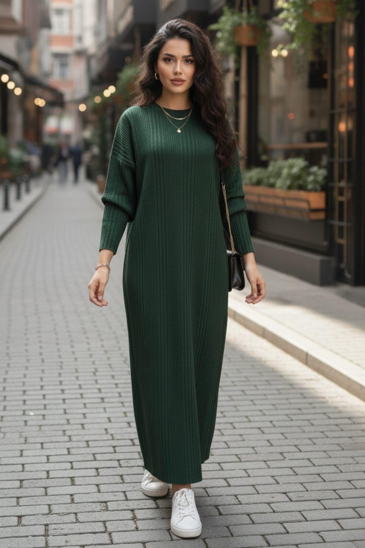 Yeşil Rahat Kalıp Esnek Kumaş Uzun Triko Elbise (DG5540-YEŞİL)