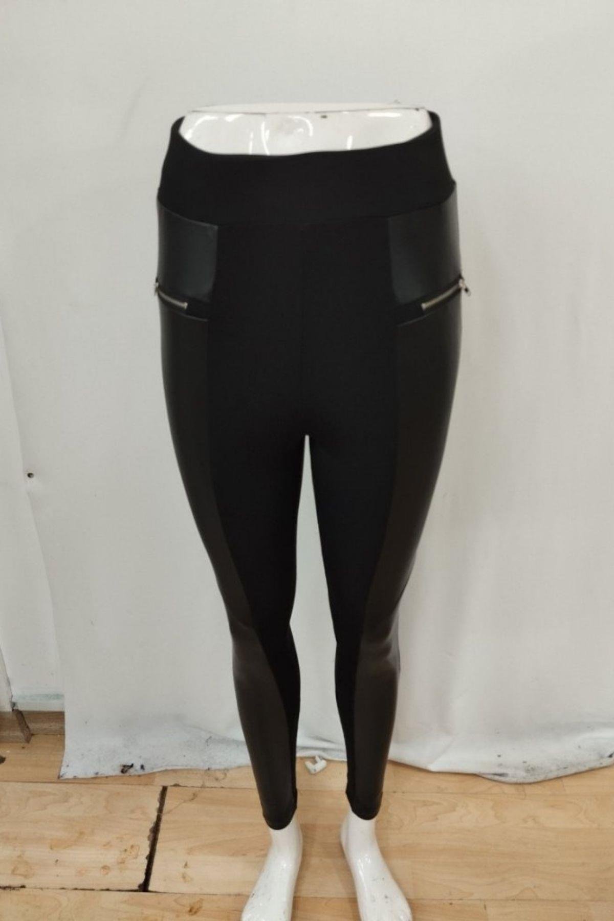 Deri Detaylı Fermuarlı Yüksek Bel Tayt Pantolon