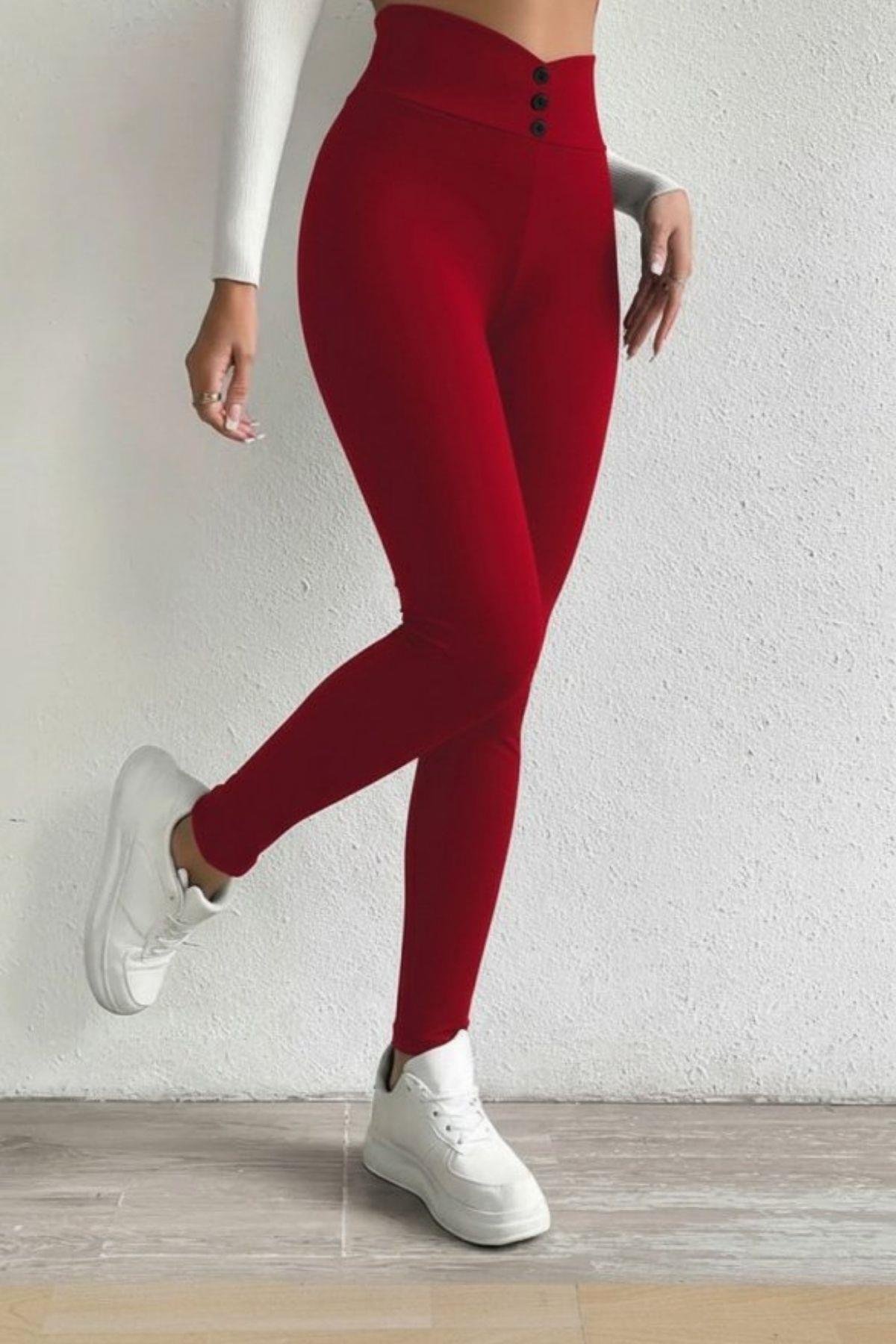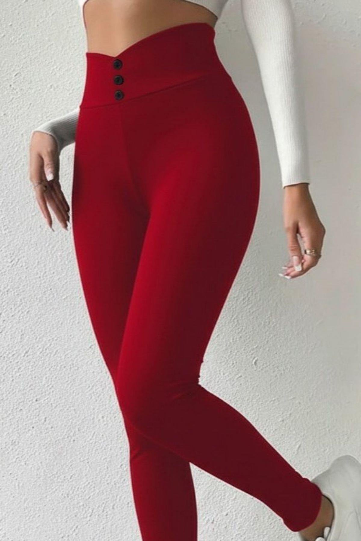 Yüksek Bel Düğmeli Dalgıç Tayt - Kırmızı