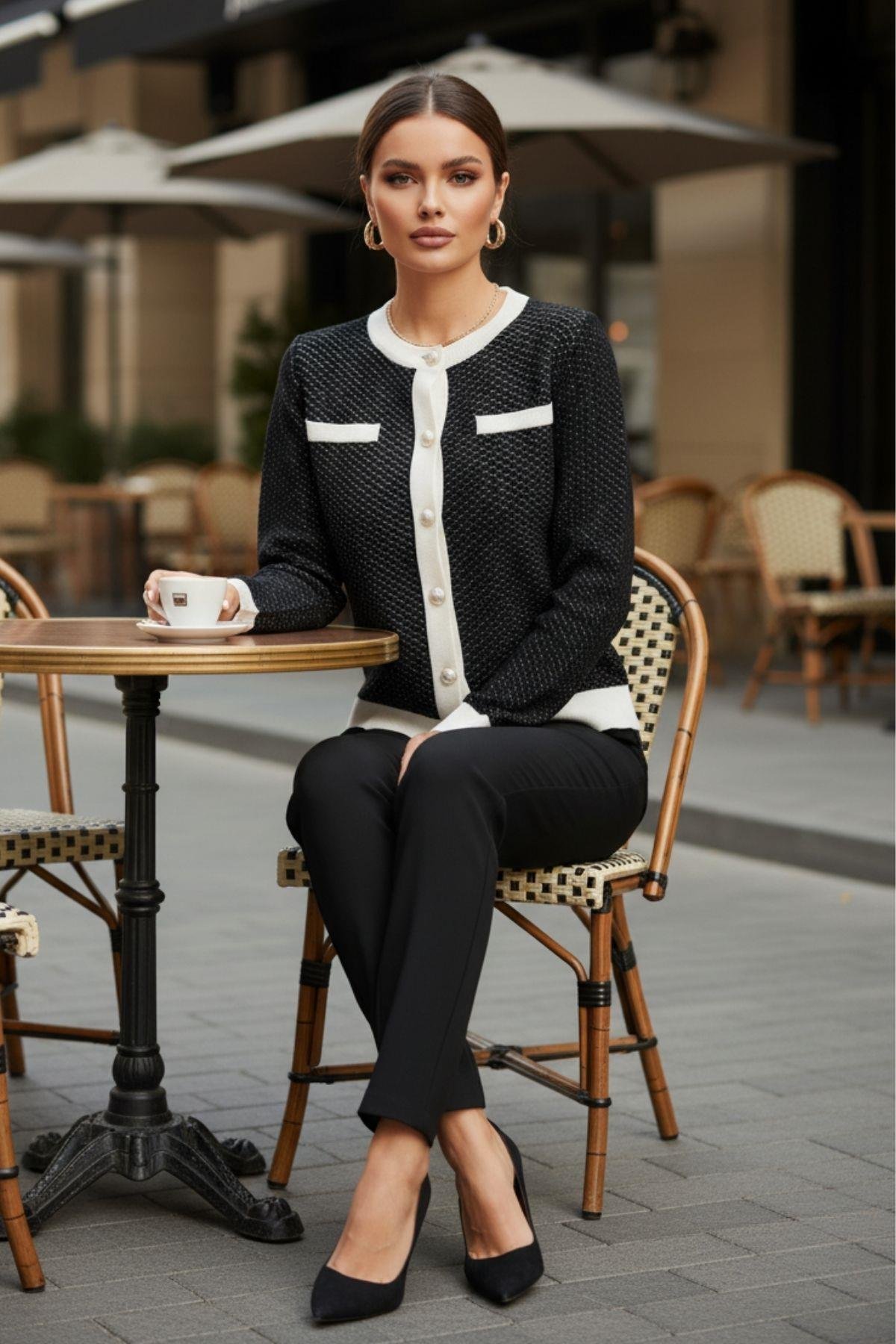 Klasik zarafeti modern dokunuşlarla birleştiren bu şık hırka ile tarzınıza sofistike bir hava katın. Yumuşak dokulu kalın örgü kumaşı hem sıcak tutar hem de göz alıcı bir doku sunar. Hırkanın en dikkat çekici detayları, yaka, cep ve kol uçlarındaki kontrast renkli biye ve inci görünümlü düğmeleridir.