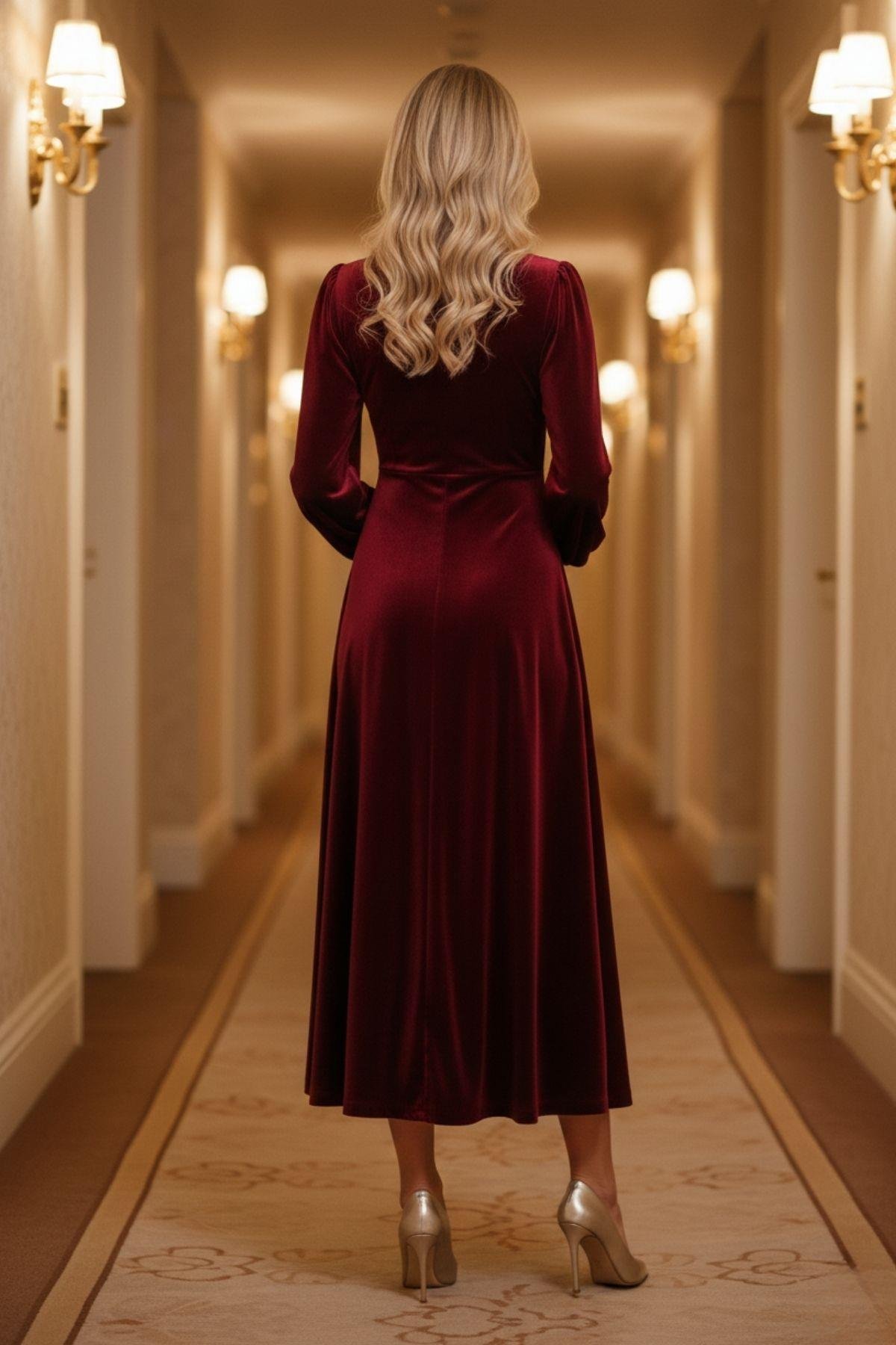 Zarafetin Dokunuşu: Uzun Kollu Kadife Midi Elbise