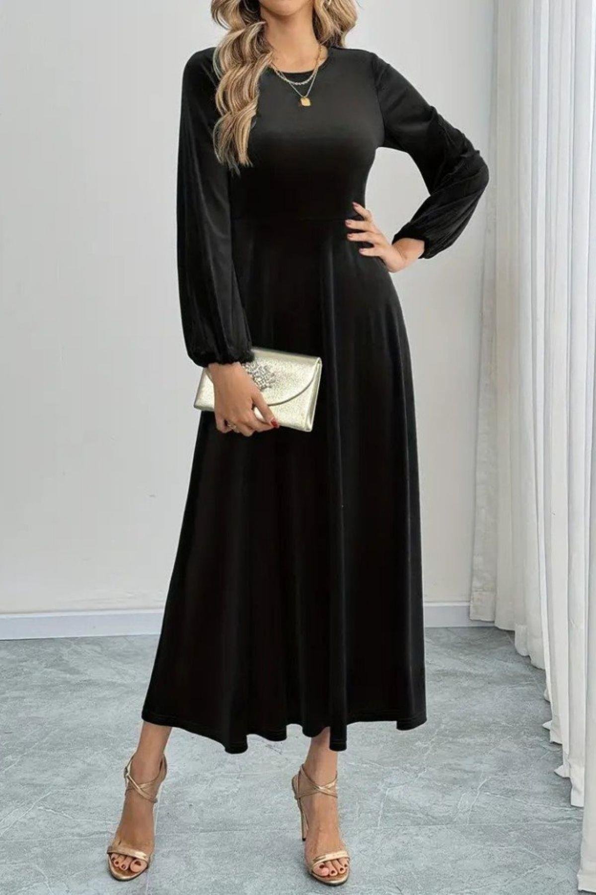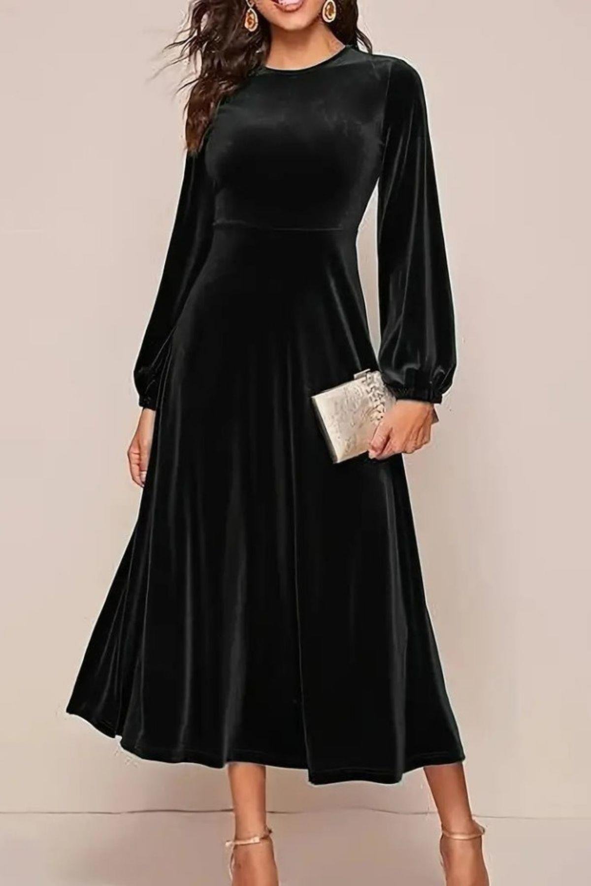 Yuvarlak Yaka Kadife Kumaş Midi Elbise - Siyah