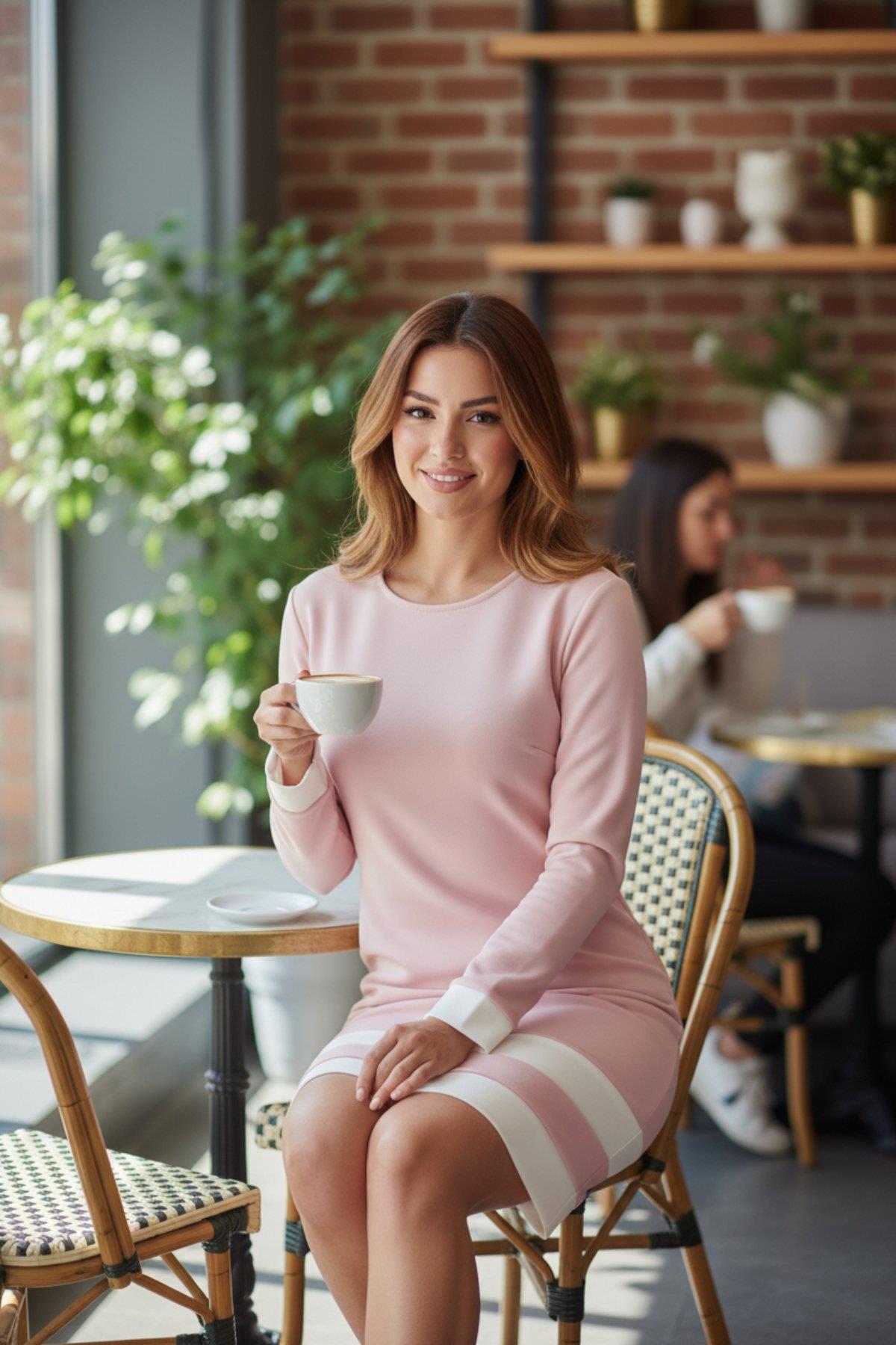 Zamansız şıklığı ve modern tasarımı birleştiren bu elbise, günlük kullanım ve rahat ofis stiliniz için idealdir. Boyun kısmındaki zarif yuvarlak yaka ve düz kesimi, rahatlığı ön planda tutarken, kontrast renkli şerit detayları ile dinamik bir görünüm sağlar.