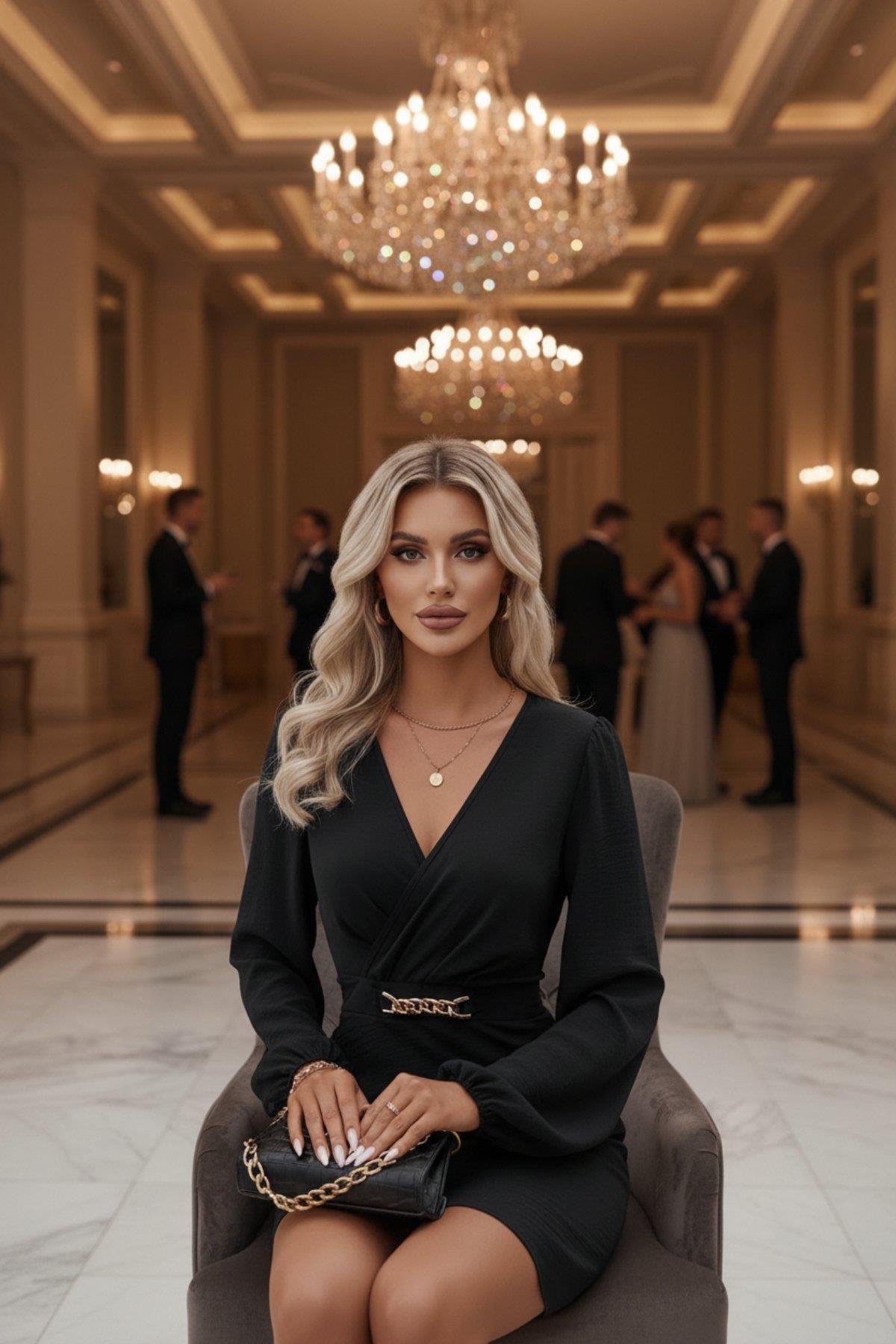 Özel davetlerinizin ve şık buluşmalarınızın vazgeçilmezi olacak bu zincir detaylı kruvaze elbise, zarif ve modern bir görünüm sunar. V yaka kesimi ve beldeki altın rengi zincir detayı, elbiseye sofistike bir hava katarken, kruvaze kesimi vücut hatlarınızı kusursuzca ortaya çıkarır. Uzun ve hacimli kolları, hareketli ve romantik bir stil oluşturur. İster topuklu ayakkabılarla bir kokteyl partisinde, ister şık botlarla romantik bir akşam yemeğinde tercih edin, bu elbise tüm bakışları üzerinize çekecek. Yüksek kaliteli kumaşı sayesinde rahat bir kullanım sunarken, iddialı tasarımıyla her anınıza zarafet katar.